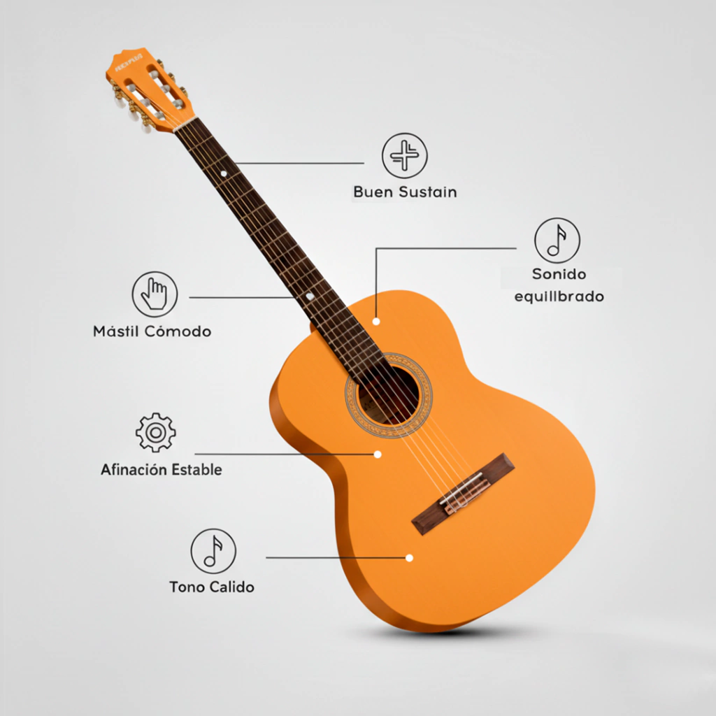 Fabricada con madera de tilo (linden plywood) de buena calidad en la tapa, el fondo y los aros, esta guitarra ofrece un tono cálido y equilibrado, ideal para practicar los fundamentos de la música clásica. El mástil de abedul y el diapasón de arce brindan una sensación cómoda y un tacto suave, mientras que el puente de palo de rosa artificial asegura una afinación estable y una excelente transferencia de vibración.