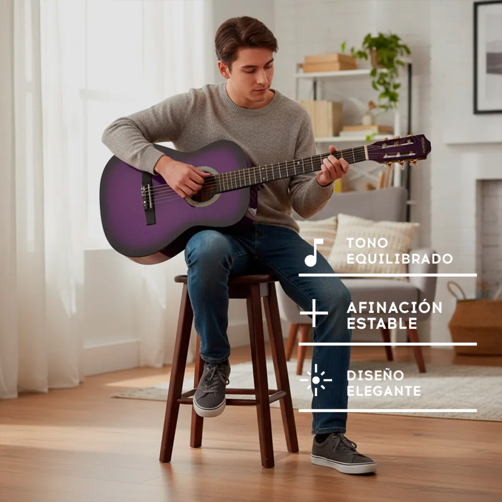 Su diseño cuenta con un elegante acabado de ribete decorativo, lo que la convierte en una opción tanto funcional como visualmente atractiva para quienes buscan su primera guitarra clásica.