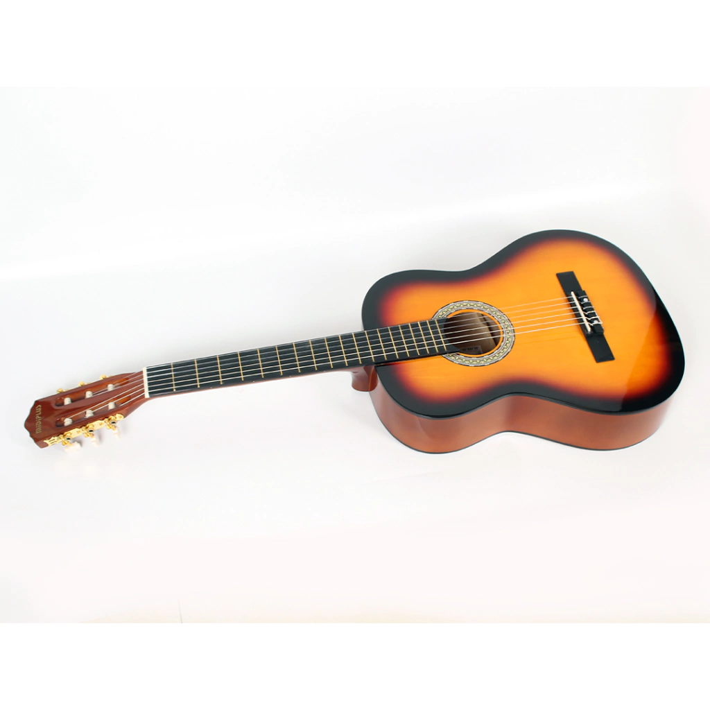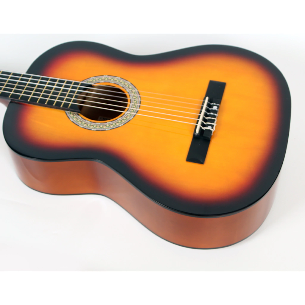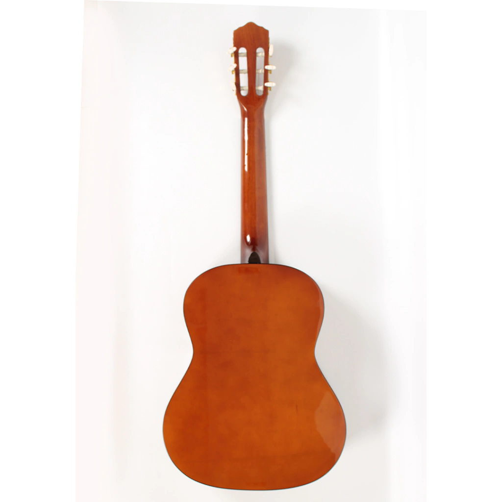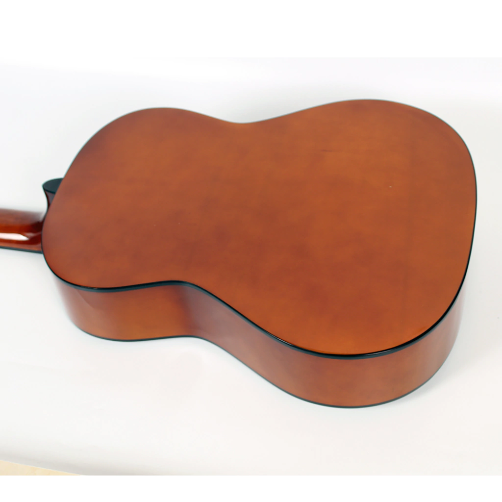 Su diseño cuenta con un elegante acabado de ribete decorativo, lo que la convierte en una opción tanto funcional como visualmente atractiva para quienes buscan su primera guitarra clásica.