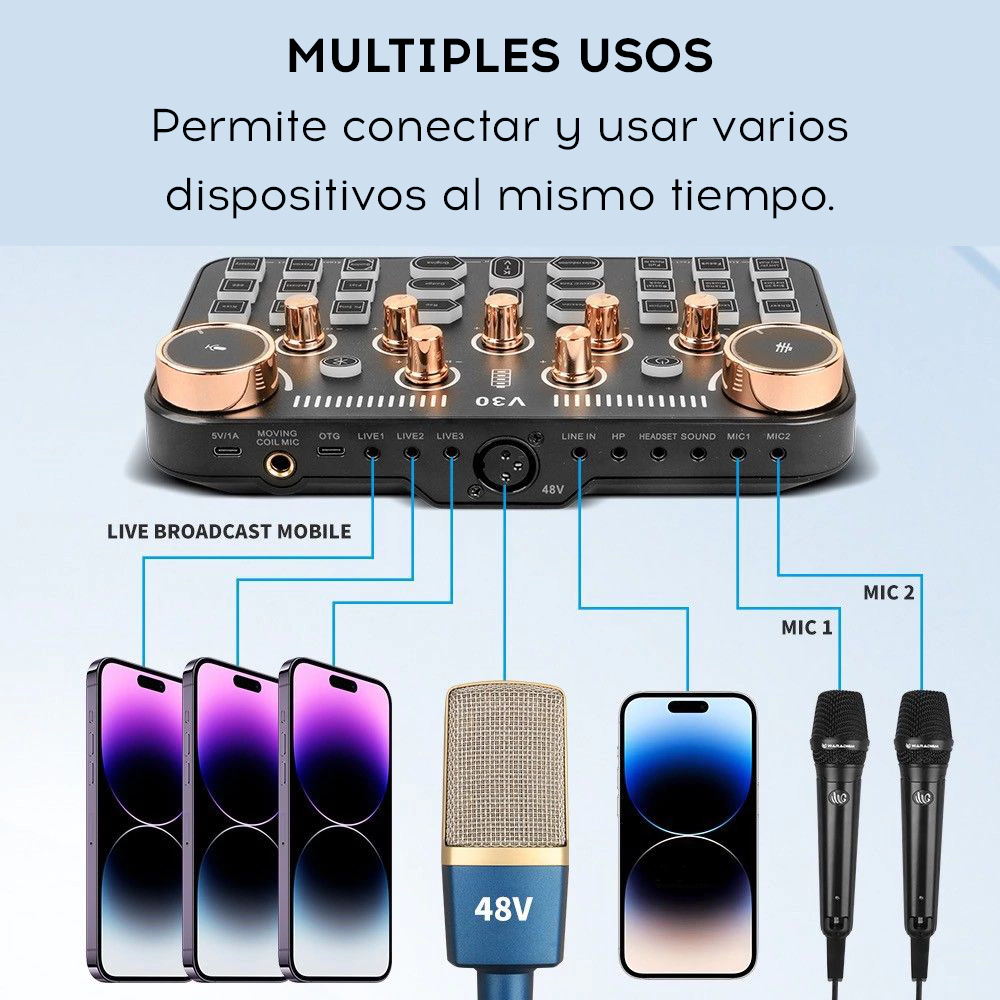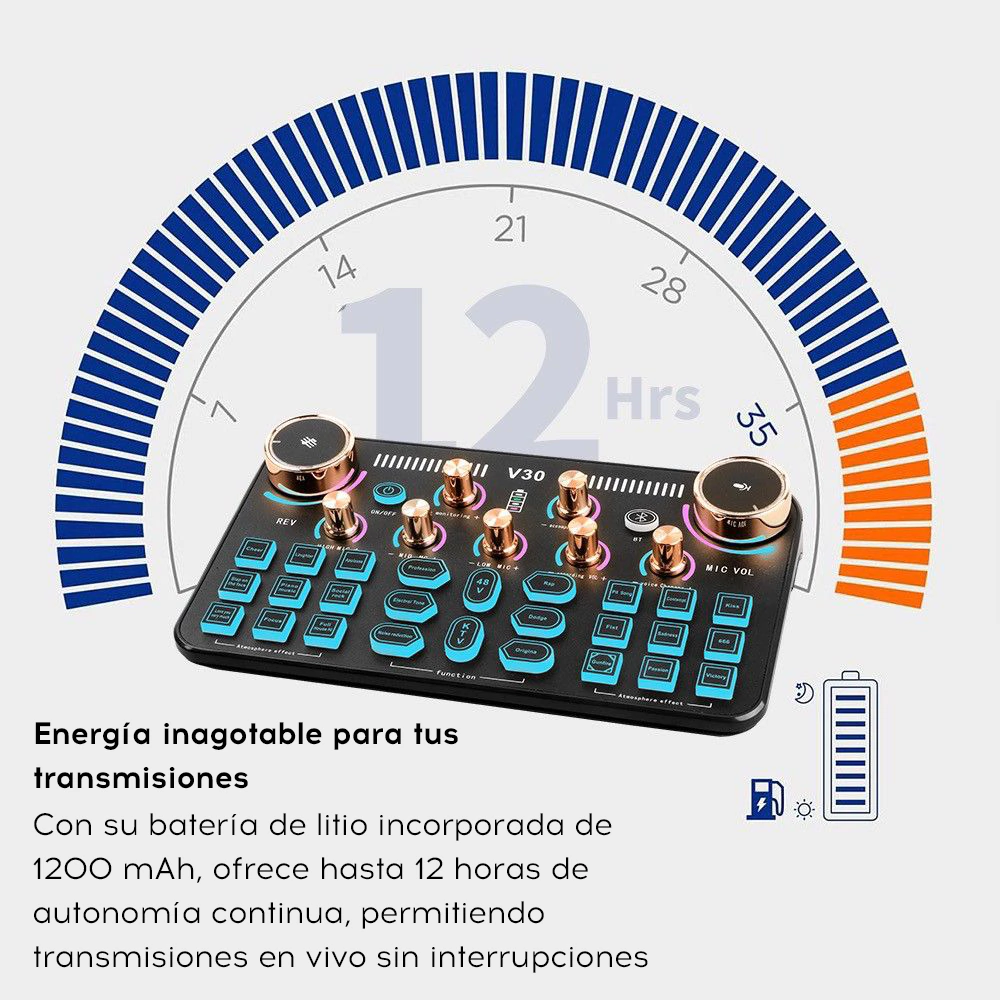 La placa de sonido MDIPLUS V30 aprovecha el poder del nuevo procesador de señal de audio digital DSP profesional de última generación integrado, para brindar una experiencia de uso más estable y fluida, con funciones sumamente potentes. Permite ajustar el volumen del micrófono y el ecualizador (tonos graves, medios y agudos) según el tono de voz personal, el entorno de uso y el dispositivo de salida, para obtener resultados óptimos y una experiencia mejorada. Incorpora funciones adicionales como reducción de ruido, reproducción interna y pausa en la reproducción del acompañamiento por Bluetooth. Cuenta con una interfaz para micrófono dinámico de 6,35 mm y una interfaz XLR de 48V. Además, viene equipado con una variedad de efectos de sonido que lo hacen más conveniente de utilizar, con un abanico más amplio de opciones, mayor diversión y funcionalidades más robustas.