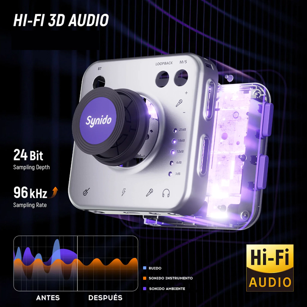 La interfaz de audio Synido Live Dock A20 es la herramienta ideal para músicos, creadores de contenido y streamers que buscan una grabación de audio clara y de alta calidad. Con una resolución de 24 bits/96 kHz, este dispositivo captura todos los matices de tu interpretación, garantizando un sonido preciso y sin interrupciones.