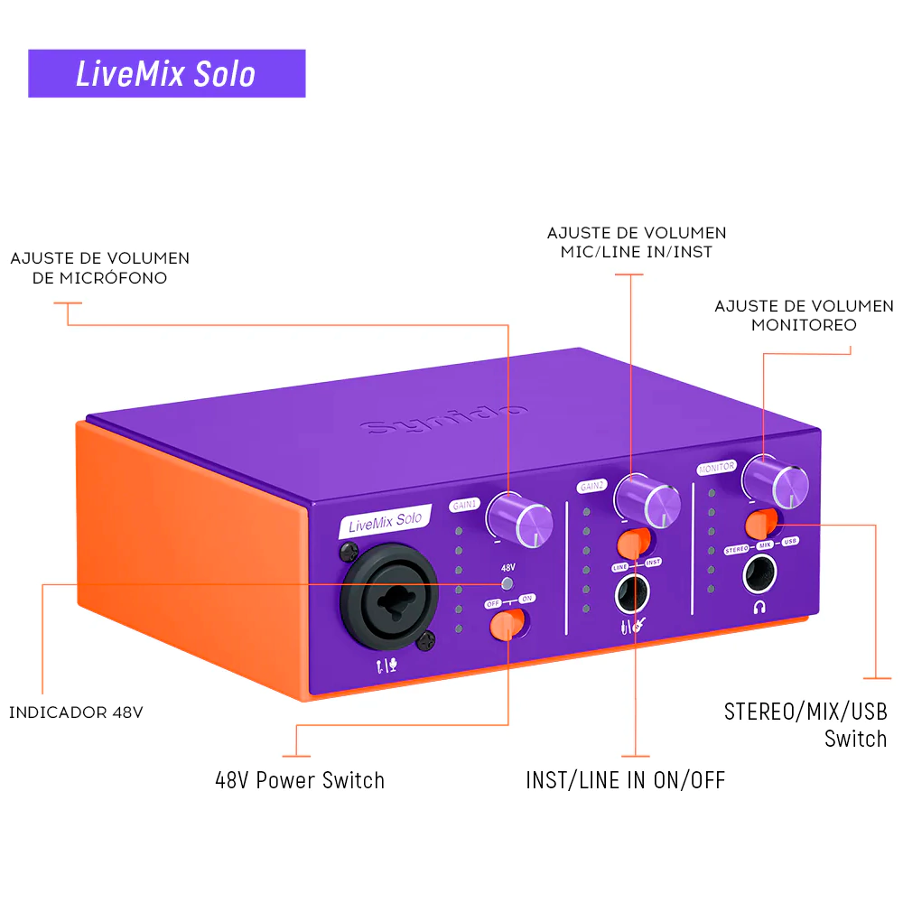 La interfaz de audio Synido LiveMix Solo es un equipo todo-en-uno que ofrece grabación de alta definición y una calidad de sonido profesional. Con un diseño compacto y una amplia compatibilidad, es ideal para grabar en cualquier momento y en cualquier lugar, ya sea desde un escritorio o un dispositivo móvil.